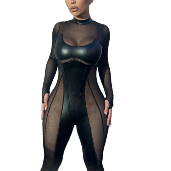Ignite the night with a look that masterfully plays with shadow and skin. First, the strategic patchwork mesh detailing creates an irresistible see-through effect that highlights your physique in all the right places. Additionally, the long-sleeve design adds a layer of sophisticated mystery, balancing the provocative sheer panels with a sleek, high-fashion edge.